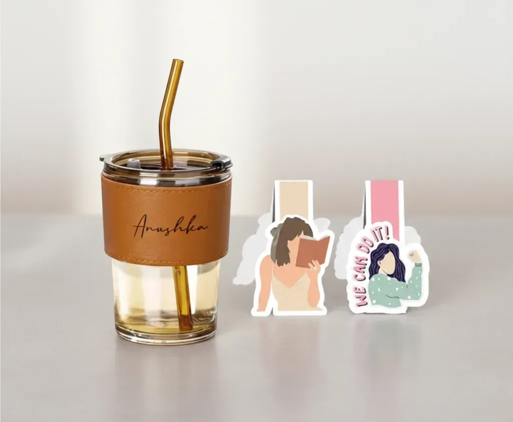 Glass Tumbler with Vegan Leather holder and Straw (Customization will logo / recipients name)