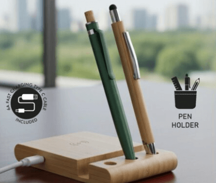 – Sleek multifunctional design combining wireless charging, phone stand, and pen holder