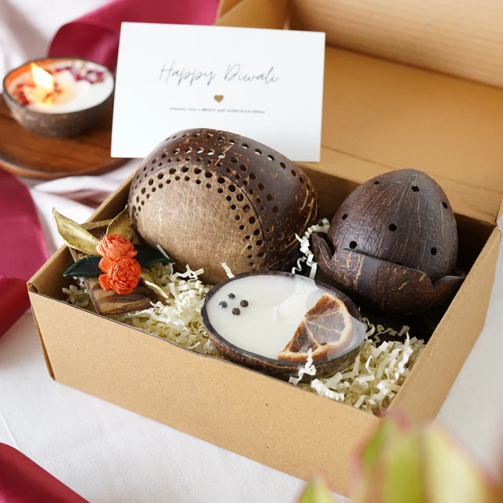 This exquisite set includes a beautifully handcrafted candle, a tea light holder, a dhoop stand and a message card.