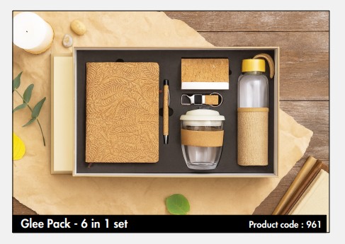 Eco Friendly A5 Notebook, Bamboo Pen, Glass Tumbler with Eco Sleeve, Card Holder, Key chain & Borosilite Bottle with Jute Sleeve